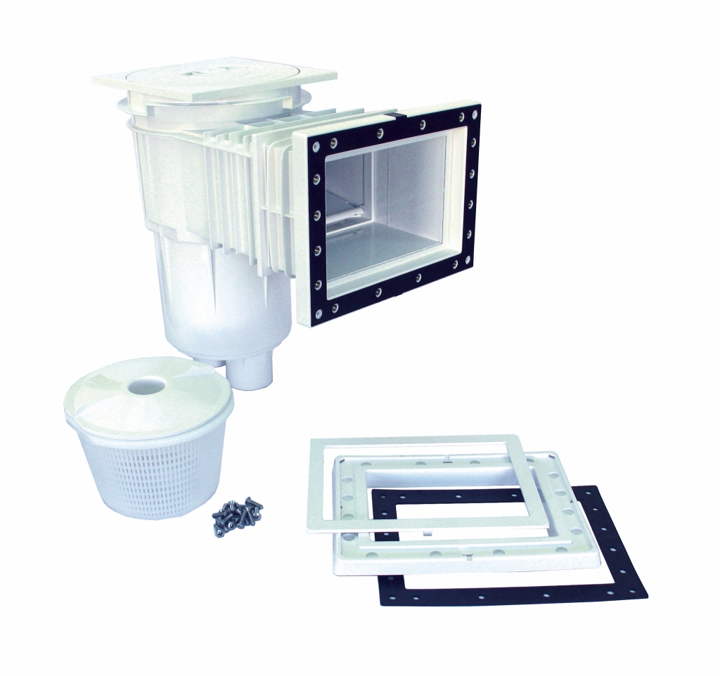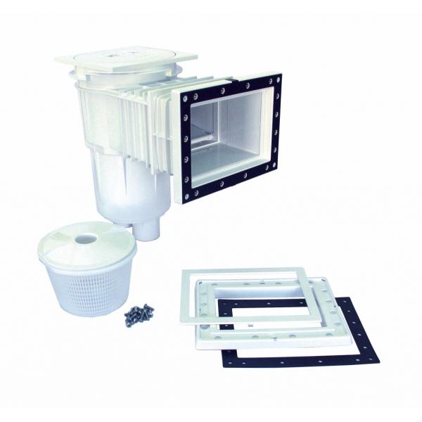 Suministrados con juntas adhesivas, marco de bi-inyección, bridas y tornillos. Todos los skimmers de la gama tienen tratamiento UV en las partes que no quedan enterradas. Fabricados en ABS blanco, con flotador de compuerta y tapón para regulación de caudal. Conexión inferior de aspiración: rosca interior 11/2″, exterior 2″. Conexión simultánea al sumidero: Ø interior 50. Conexión superior de evacuación de agua sobrante Ø 40. Cesto recogehojas fijado a la base mediante cierre por bayoneta. Caudal recomendado 7,5 m3/h. Se recomienda instalar un skimmer por cada 25 m2 de superficie de lámina de agua.